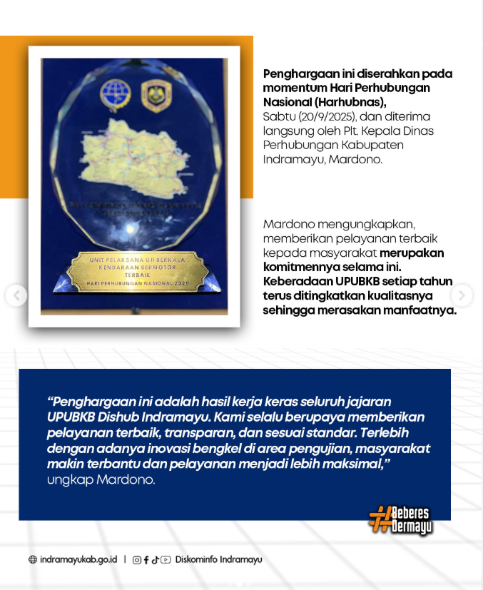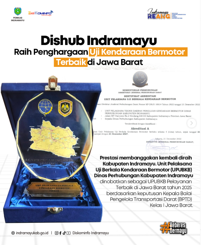 Indramayu, Jawa Barat – Pada momentum Hari Perhubungan Nasional (Harhubnas) 2025, Dinas Perhubungan Kabupaten Indramayu berhasil meraih predikat Unit Pelaksana Uji Berkala Kendaraan Bermotor (UPUBKB) Terbaik se-Jawa Barat. Penghargaan ini menegaskan komitmen Dishub Indramayu dalam memberikan pelayanan publik yang transparan, akurat, dan sesuai standar nasional.